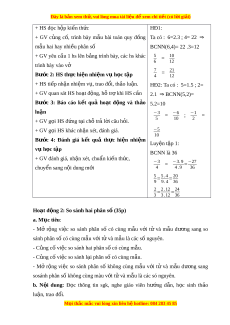 Ta có : 6 = 2.3 ; 4 = 2.2 ⇒ + HS ti p ế nh n ậ nhi m ệ v , ụ trao đ i ổ , th o ả BCNN(6,4) = 22 . 3 = 12 lu n. ậ 5 + GV quan sát HS ho t ạ đ ng, ộ hỗ trợ khi = 10 ; 3 = 9 Vì 6 12 4 12 HS c n ầ 10 9 5 10>9 nên > hay Bư c ớ 3: Báo cáo k t ế quả ho t ạ đ ng ộ và 12 12 6 thảo luận 3 > 4 + GV g i ọ HS đ ng ứ t i ạ ch t ỗ r l ả i ờ câu h i ỏ . K tế lu n : ậ Ph n bánh còn l ầ i ạ c a ủ + GV g i ọ HS khác nh n xét ậ , đánh giá. b n t ạ ròn nhi u h ề n ph ơ n bánh ầ Bư c ớ 4: Đánh giá k t ế quả th c ự hi n ệ còn l i ạ c a ủ b n vuông. ạ nhi m ệ v h ụ c t ọ p ậ Luy n t ệ ập 3: + GV đánh giá, nh n xét ậ , chu n ki ẩ n ế