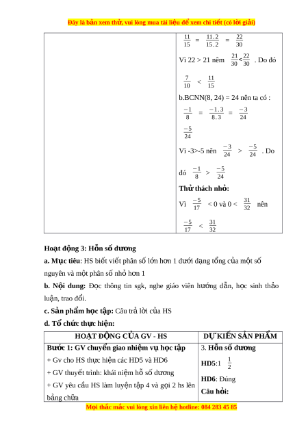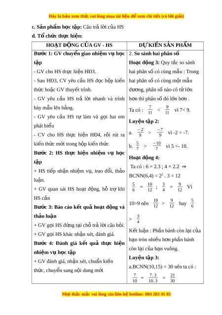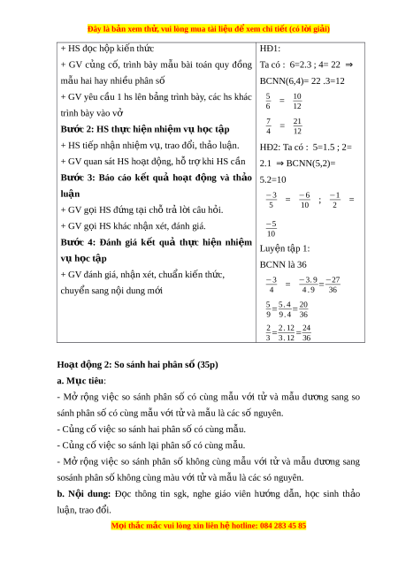 Đây là bản xem th , vu ử i lòng mua tài li u ệ đ xe ể m chi ti t ế (có l i ờ gi i ả ) + HS đ c h ọ p ki ộ n t ế h c ứ HĐ1: + GV c ng ủ c , ố trình bày m u ẫ bài toán quy đ ng ồ Ta có : 6=2.3 ; 4= 22 ⇒ mẫu hai hay nhi u phân s ề ố BCNN(6,4)= 22 .3=12 + GV yêu c u ầ 1 hs lên b ng ả trình bày, các hs khác 5 = 10 6 12 trình bày vào vở 7 Bư c ớ 2: HS th c hi ự n nh ệ i m ệ v h ụ c t ọ p ậ = 21 4 12 + HS ti p ế nh n nhi ậ m ệ v , t ụ rao đ i ổ , th o ả lu n. ậ HĐ2: Ta có : 5=1.5 ; 2= + GV quan sát HS ho t ạ đ ng, ộ h t ỗ r khi ợ HS c n ầ 2.1 ⇒ BCNN(5,2)= Bư c ớ 3: Báo cáo k t ế quả ho t ạ đ ng ộ và th o ả 5.2=10 luận −3 = −6 ; −1 = + GV g i ọ HS đ ng ứ t i ạ ch t ỗ r l ả i ờ câu h i ỏ . 5 10 2 + GV g i ọ HS khác nh n xét ậ , đánh giá. −5 10 Bư c ớ 4: Đánh giá k t ế quả th c ự hi n ệ nhi m ệ Luyện t p ậ 1: vụ h c t ọ ập BCNN là 36 + GV đánh giá, nh n xét ậ , chu n ki ẩ n t ế h c, ứ −3 = −3.9 −27 = chuy n s ể ang n i ộ dung m i ớ 4 4 . 9 36 5 5 . 4 20 = = 9 9 . 4 36 2 2 . 12 24 = = 3 3 . 12 36 Hoạt đ ng ộ
