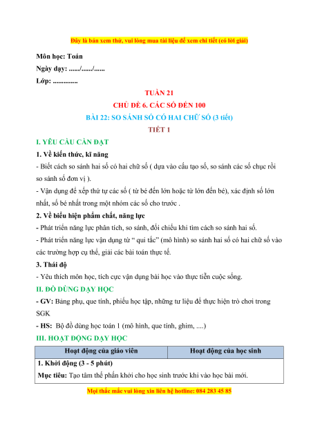 BÀI 22: SO SÁNH SỐ CÓ HAI CHỮ SỐ (3 tiết) TIẾT 1 I. YÊU CẦU CẦN ĐẠT