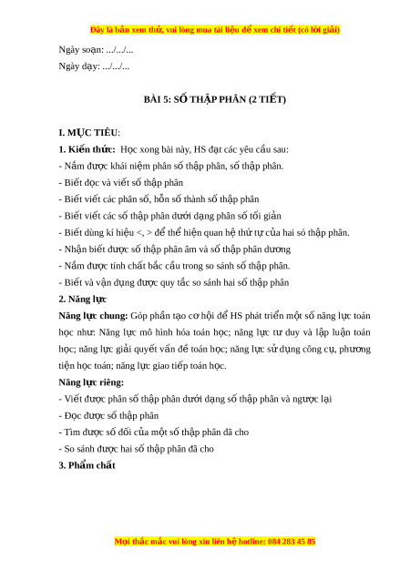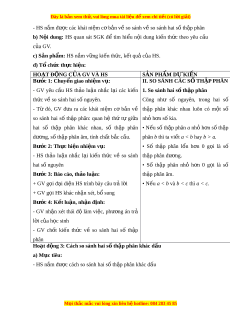ế dùng kí hi u <, > đ ệ t ể hể hi n quan h ệ t ệ h t ứ c ự a ủ hai só th p ậ phân. - Nh n ậ bi t ế đư c ợ s t ố h p phân âm ậ và s t ố h p phân d ậ ư ng ơ - N m ắ đư c t ợ ính ch t ấ b c ắ c u t ầ rong so sánh số th p ậ phân. - Bi t ế và v n d ậ ng ụ đư c quy t ợ c ắ so sánh hai s t ố h p ậ phân 2. Năng l c ự Năng l c ự chung: Góp ph n ầ t o ạ c ơ h i ộ đ ể HS phát tri n ể m t ộ s ố năng l c ự toán h c ọ nh : ư Năng l c ự mô hình hóa toán h c; ọ năng l c ự tư duy và l p ậ lu n ậ toán h c; ọ năng l c ự gi i ả quy t ế v n ấ đ ề toán h c; ọ năng l c ự s ử d ng ụ công c , ụ phư ng ơ ti n h ệ c ọ toán; năng l c gi ự ao ti p t ế oán h c. ọ Năng l c ự riêng: - Vi t ế đư c ợ phân số th p phân d ậ ư i ớ d ng s ạ t ố h p ậ phân và ngư c ợ l i ạ - Đ c ọ đư c s ợ ố th p ậ phân - Tìm đư c ợ s đ ố i ố c a ủ m t ộ s t ố h p ậ phân đã cho - So sánh đư c hai ợ số th p phân đã cho ậ 3. Ph m ẩ chất M i ọ thắc m c