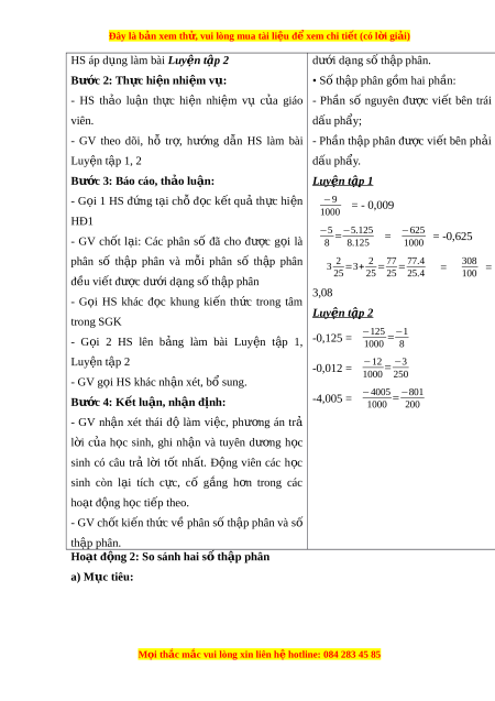 Đây là bản xem th , vu ử i lòng mua tài li u ệ đ xe ể m chi ti t ế (có l i ờ gi i ả ) HS áp d ng l ụ àm bài Luy n t ệ p 2 ậ dư i ớ d ng ạ số th p phân. ậ Bư c ớ 2: Th c hi ự n nhi ệ m ệ v : ụ • Số th p ậ phân g m ồ hai ph n: ầ - HS th o ả lu n ậ th c ự hi n ệ nhi m ệ vụ c a ủ giáo - Ph n ầ số nguyên đư c ợ vi t ế bên trái viên. dấu phẩy; - GV theo dõi, hỗ tr , ợ hư ng ớ d n ẫ HS làm bài - Ph n ầ th p ậ phân đư c ợ vi t ế bên ph i ả Luyện t p ậ 1, 2 dấu phẩy. Bư c