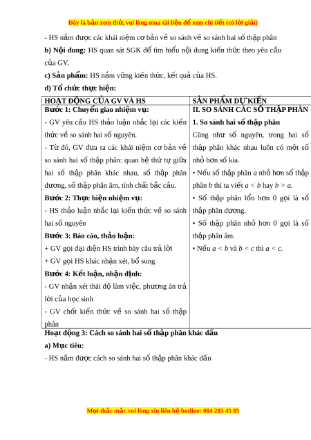 ậ xét thái độ làm vi c, ệ phư ng ơ án trả l i ờ c a ủ h c ọ sinh, ghi nh n ậ và tuyên dư ng ơ h c ọ sinh có câu trả l i ờ t t ố nh t ấ . Đ ng ộ viên các h c ọ sinh còn l i ạ tích c c, ự cố g ng ắ h n ơ trong các ho t ạ đ ng h ộ c ọ ti p t ế heo. - GV chốt ki n t ế h c ứ v phân ề số th p phân và ậ số th p phân. ậ Hoạt đ ng 2: ộ So sánh hai s t ố h p phân ậ a) M c t ụ iêu: M i ọ thắc m c