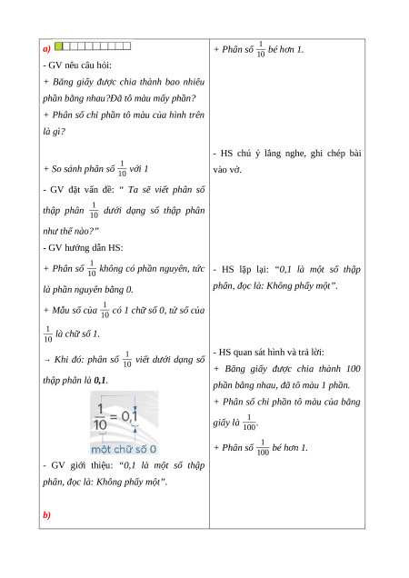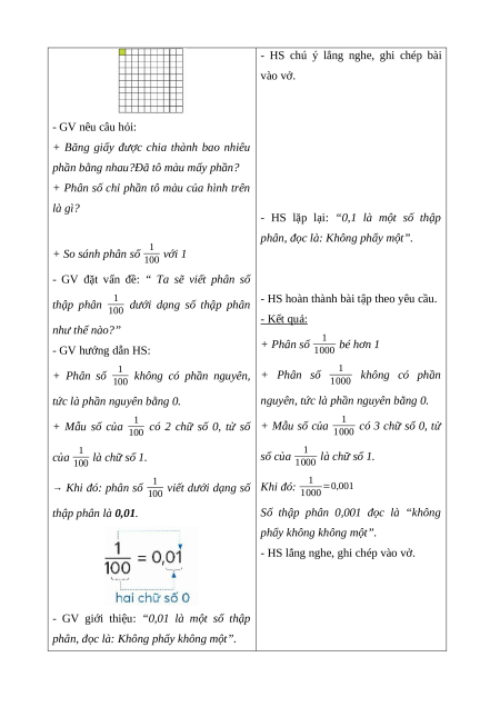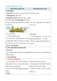 - HS nhận biết được khái niệm số thập phân; lập số, đọc, viết các số thập phân ở dạng đơn giản. * Cách tiến hành: