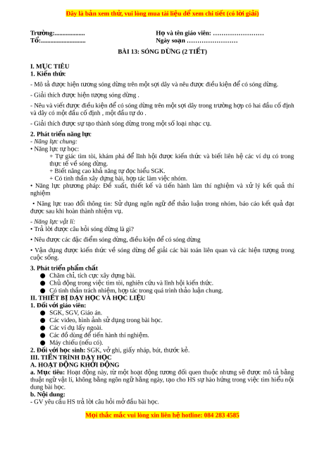 Ngày soạn …………………… BÀI 13: SÓNG D N Ừ G (2 TI T) Ế I. MỤC TIÊU 1. Ki n ế th c ứ - Mô tả đư c ợ hi n t ệ ư ng ơ sóng d ng ừ trên m t ộ s i ợ dây và nêu đư c ợ đi u ki ề n đ ệ c ể ó sóng d ng. ừ - Giải thích đư c ợ hi n t ệ ư ng ợ sóng d ng . ừ - Nêu và viết đư c ợ đi u ki ề n đ ệ c ể ó sóng d ng t ừ rên m t ộ s i ợ dây trong trư ng h ờ p ợ có hai đ u c ầ đ ố nh ị và dây có m t ộ đầu cố đ nh ị , m t ộ đầu tự do . - Giải thích đư c ợ s t ự o t ạ hành sóng d ng t ừ rong m t ộ s l ố o i ạ nh c ạ c . ụ 2. Phát tri n ể năng l c ự - Năng l c ự chung: • Năng l c ự tự h c ọ :