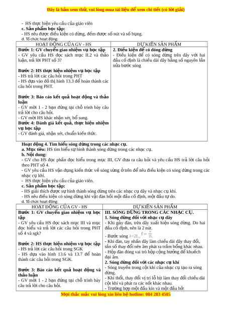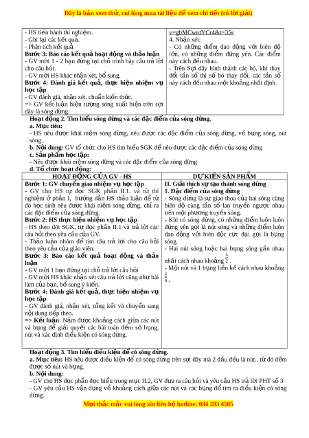 Đây là bản xem th , vu ử i lòng mua tài li u ệ đ xe ể m chi ti t ế (có l i ờ gi i ả ) - HS th c ự hi n yê ệ u cầu c a ủ giáo viên c. Sản ph m h ẩ c ọ t p ậ : - HS nêu đư c ợ đi u ki ề n c ệ ó d ng, ừ đ m ế đư c ợ s nút ố và s b ố ng. ụ d. Tổ chức hoạt động: HOẠT Đ N Ộ G C A Ủ GV - HS D K Ự IẾN SẢN PH M Ẩ Bư c ớ 1: GV chuy n ể giao nhi m v ệ h ụ c ọ t p ậ 2. Đi u ề ki n ệ đ c ể ó dóng d n ừ g - GV yêu c u ầ HS đ c ọ sách m c ụ II.2 và th o ả - Đi u ề ki n ệ để có sóng d ng ừ trên dây v i ớ hai luận, trả l i ờ PHT s 3? ố đầu cố đ nh ị là chi u ề dài dây b ng ằ s ố nguyên l n ầ n a ử bư c ớ sóng Bư c ớ 2: HS th c ự hi n ệ nhi m ệ v h ụ c ọ t p ậ - HS trả l i ờ các câu h i ỏ trong PHT - HS d a ự vào đ ồ th ịhình 13.3 đ ể hoàn thành các câu h i ỏ trong PHT. Bư c ớ 3: Báo cáo k t ế quả ho t ạ đ n ộ g và th o ả lu n ậ - GV m i ờ 1 - 2 b n ạ đ ng ứ t i ạ chỗ trình bày câu trả l i ờ cho câu h i ỏ . - GV m i ờ HS khác nh n xé ậ t, b s ổ ung. Bư c ớ 4: Đánh giá k t ế qu , ả th c ự hi n ệ nhi m ệ v h ụ ọc tập