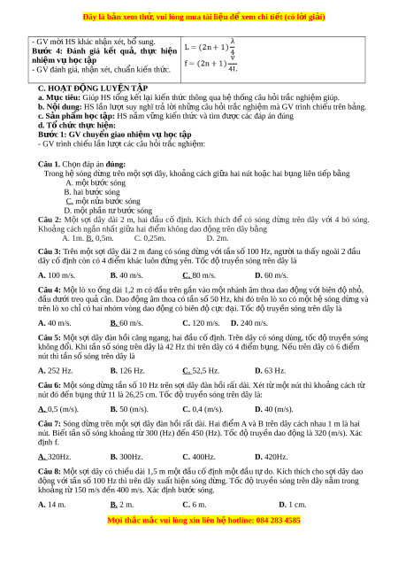 Câu 8: M t s i dây có chi u dài 1,5 m m t đ u c đ nh m t đ u t do. Kích thích cho s i dây dao ộ ợ ề ộ ầ ố ị ộ ầ ự ợ