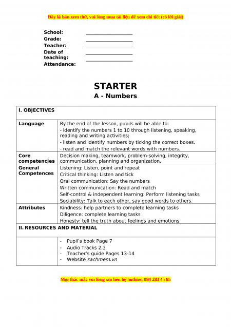 School: ____________________ Grade: ____________________ Teacher: ____________________ Date of ____________________ teaching: ____________________ Attendance: STARTER A - Numbers I. OBJECTIVES Language