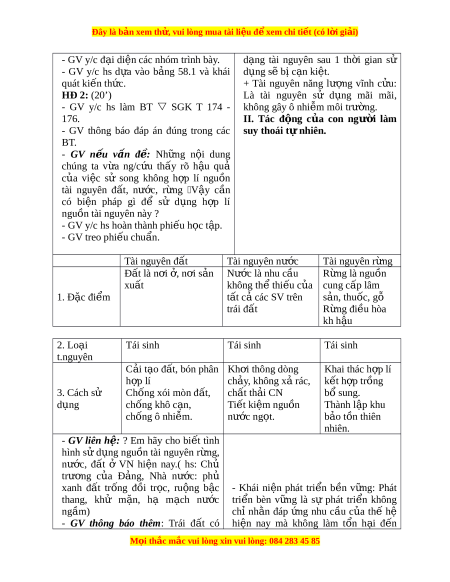 - GV y/c hs hoàn thành phi u h ế c ọ t p. ậ - GV treo phi u chu ế n. ẩ Tài nguyên đ t ấ Tài nguyên nư c ớ Tài nguyên r ng ừ Đất là n i ơ , n ở i ơ s n ả Nư c l ớ à nhu c u ầ R ng ừ là nguồn xu t ấ không th t ể hi u c ế a ủ cung cấp lâm 1. Đặc đi m ể tất c các ả SV trên s n, t ả huốc, gỗ trái đ t ấ R ng ừ đi u hòa ề kh h u ậ 2. Lo i ạ Tái sinh Tái sinh Tái sinh t.nguyên C i ả t o ạ đ t ấ , bón phân Kh i ơ thông dòng Khai thác h p l ợ í h p ợ lí ch y ả , không x r ả ác, k t ế h p t ợ rồng 3. Cách sử Chống xói mòn đ t ấ , chất th i ả CN bổ sung. d ng ụ chống khô c n, ạ Ti t ế kiệm nguồn Thành l p ậ khu chống ô nhi m ễ . nư c ớ ng t ọ . b o t ả ồn thiên nhiên. - GV liên h :