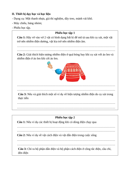 - Dụng cụ: Một thanh nhựa, giá thí nghiệm, dây treo, mảnh vải khô. - Máy chiếu, bảng nhóm; - Phiếu học tập. Phiếu học tập 1