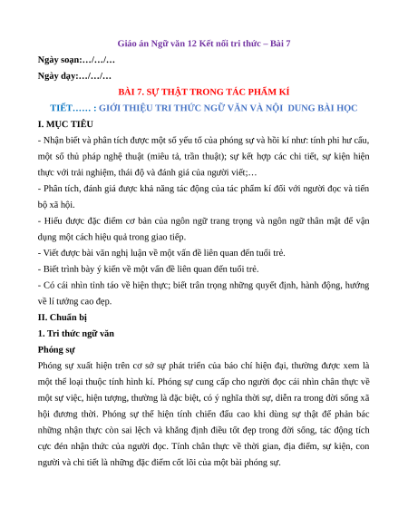 Giáo án Sự thật trong tác phẩm kí (2024) Kết nối tri thức