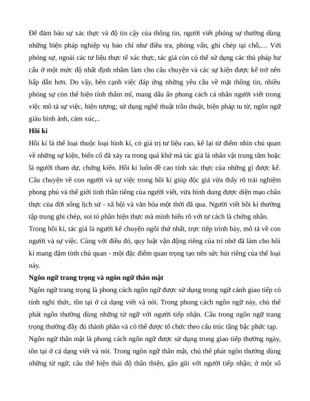 - Nhận biết và phân tích được một số yếu tố của phóng sự và hồi kí như: tính phi hư cấu,