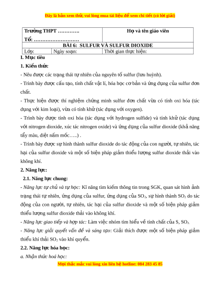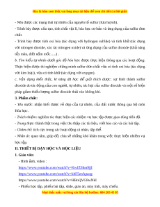 BÀI 6: SULFUR VÀ SULFUR DIOXIDE L p ớ : Ngày so n: ạ Th i ờ gian th c ự hi n ệ : I. M c t ụ iêu 1. Ki n t ế h c ứ - Nêu đư c ợ các tr ng t ạ hái t nhi ự ên c a ủ nguyên t s ố ulfur (l u huỳnh ư ). - Trình bày đư c ợ c u ấ t o, ạ tính ch t ấ v t ậ lí, hóa h c ọ c b ơ n ả và ng ứ d ng ụ c a ủ sulfur đ n ơ chất. - Th c ự hi n ệ đư c ợ thí nghi m ệ ch ng ứ minh sulfur đ n ơ ch t ấ v a ừ có tính oxi hóa (tác d ng v ụ i ớ kim lo i ạ ), v a ừ có tính kh ( ử tác d ng v ụ i ớ oxygen). - Trình bày đư c ợ tính oxi hóa (tác d ng ụ v i