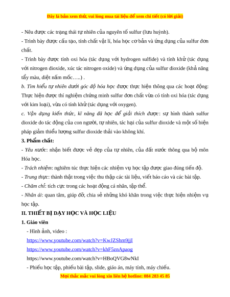 Đây là bản xem th , vu ử i lòng mua tài li u ệ đ xe ể m chi ti t (c ế ó l i ờ gi i ả ) - Nêu đư c ợ các tr ng t ạ hái t nhi ự ên c a ủ nguyên t s ố ulfur (l u huỳnh ư ). - Trình bày đư c ợ c u ấ t o, ạ tính ch t ấ v t ậ lí, hóa h c ọ c b ơ n ả và ng ứ d ng ụ c a ủ sulfur đ n ơ chất. - Trình bày đư c ợ tính oxi hóa (tác d ng ụ v i