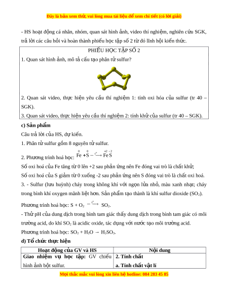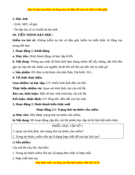 ụ Quan sát hình nh, t ả ìm câu tr l ả i ờ . Báo cáo, thảo lu n ậ : M t ộ số h c s ọ inh trình bày câu tr l ả i ờ . K t ế luận, nh n đ ậ nh: ị GV tổng k t ế , dẫn d t ắ vào bài m i ớ . 2. Hoạt đ ng 2 ộ : Hình thành ki n t ế h c m ứ i ớ Hoạt đ ng 2.1 ộ : Tr ng t ạ hái t nhi ự ên c a s ủ ulfur a) M c t ụ iêu: Nêu đư c t ợ r ng t ạ hái t nhi ự ên c a ủ sulfur. b) N i ộ dung: HS ho t ạ đ ng c ộ p ặ đôi, tr l ả i ờ phi u ế h c t ọ p t ậ ừ đó lĩnh h i ộ ki n ế th c. ứ PHI U Ế H C Ọ T P Ậ S 1 Ố 1. Quan sát hình nh, ả nêu tr ng ạ thái t nhi ự ên c a s ủ ulfur? 2. Trong t nhi ự ên, sulfur t n t ồ i ạ d ở ng h ạ p ợ ch t ấ d t ễ an hay khó tan? c) S n ph ả m ẩ : Câu trả l i ờ c a H ủ S, dự ki n: ế 1. Trong t nhi ự ên sulfur t n t ồ i ạ c d ả ng ạ đ n ch ơ t ấ và h p ch ợ t ấ . 2. H p ợ ch t ấ khó tan. M i
