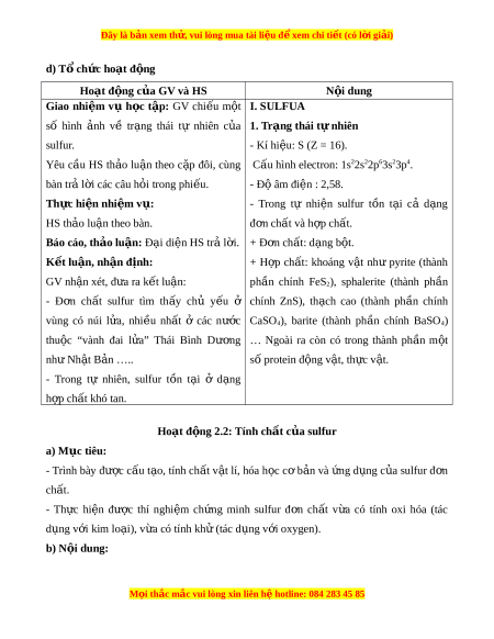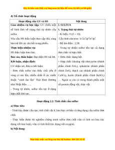 Đây là bản xem th , vu ử i lòng mua tài li u ệ đ xe ể m chi ti t (c ế ó l i ờ gi i ả ) d) T ch ổ ức ho t ạ đ ng ộ Hoạt đ ng c ộ a G ủ V và HS N i ộ dung Giao nhi m ệ vụ h c ọ t p ậ : GV chi u ế m t ộ I. SULFUA số hình nh ả về tr ng ạ thái tự nhiên c a ủ 1. Trạng thái t n ự hiên sulfur. - Kí hi u: ệ S (Z = 16). Yêu c u ầ HS th o ả lu n ậ theo c p