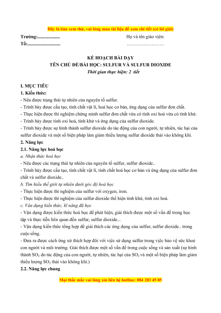 TÊN CHỦ ĐỀ/BÀI HỌC: SULFUR VÀ SULFUR DIOXIDE