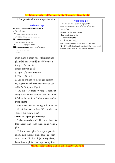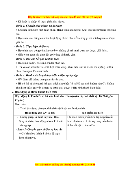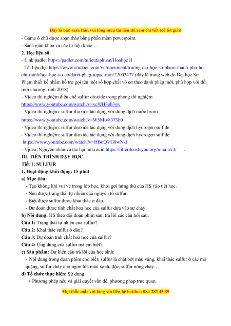 III. TIẾN TRÌNH DẠY HỌC Tiết 1: SULFUR