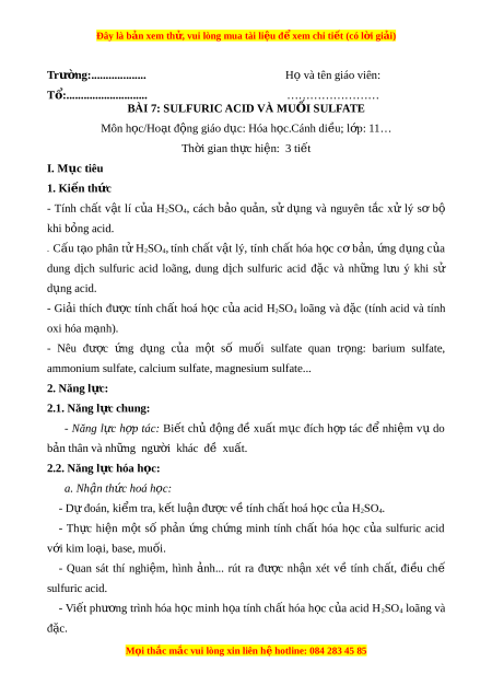 BÀI 7: SULFURIC ACID VÀ MU I Ố SULFATE Môn h c/ ọ Ho t ạ đ ng gi ộ áo d c ụ : Hóa h c.C ọ ánh di u; ề l p: ớ 11… Th i ờ gian th c ự hi n ệ : 3 ti t ế I. M c t ụ iêu 1. Ki n t ế h c ứ - Tính ch t ấ v t ậ lí c a ủ H2SO4, cách b o ả qu n, ả sử d ng ụ và nguyên t c ắ xử lý sơ bộ khi b ng aci ỏ d. - Cấu t o