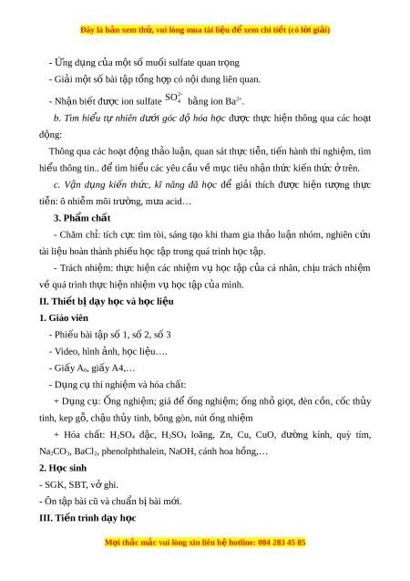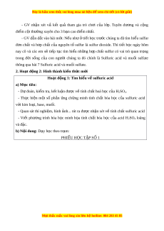 ế được ion sulfate SO 4 b ng i ằ on Ba2+. b. Tìm hi u ể tự nhiên dư i ớ góc độ hóa h c ọ đư c ợ th c ự hi n ệ thông qua các ho t ạ đ ng: ộ Thông qua các ho t ạ đ ng ộ th o ả lu n, ậ quan sát th c ự ti n, t ễ i n ế hành thí nghi m ệ , tìm hi u t ể hông tin.. đ t ể ìm hi u các ể yêu c u v ầ m ề c t ụ iêu nh n ậ th c ki ứ n t ế h c ứ t ở rên. c. V n ậ d ng ụ ki n ế th c, ứ kĩ năng đã h c ọ để gi i ả thích đư c ợ hiện tư ng ợ th c ự ti n ễ : ô nhi m ễ môi trư ng, m ờ a aci ư d… 3. Phẩm ch t ấ - Chăm ch : ỉ tích c c ự tìm tòi, sáng t o ạ khi tham gia th o ả lu n ậ nhóm, nghiên c u ứ tài li u hoàn t ệ hành phi u h ế c ọ t p t ậ rong quá trình h c ọ t p. ậ - Trách nhi m ệ : th c ự hi n ệ các nhi m ệ vụ h c ọ t p ậ c a ủ cá nhân, ch u ị trách nhi m ệ v quá ề trình th c hi ự n nhi ệ m ệ v h ụ c t ọ p ậ c a m ủ ình. II. Thi t ế b d ị y h ạ c ọ và h c l ọ i u ệ 1. Giáo viên - Phi u bài ế t p s ậ ố 1, số 2, số 3 - Video, hình nh, ả h c l ọ i u…. ệ - Giấy A0, giấy A4,… - D ng c ụ t ụ hí nghi m ệ và hóa ch t ấ : + D ng ụ c : ụ ng Ố nghi m ệ ; giá đ ể ng ố nghi m ệ ; ng ố nh ỏ gi t ọ , đèn c n ồ , c c ố th y ủ tinh, kep gỗ, ch u ậ th y t