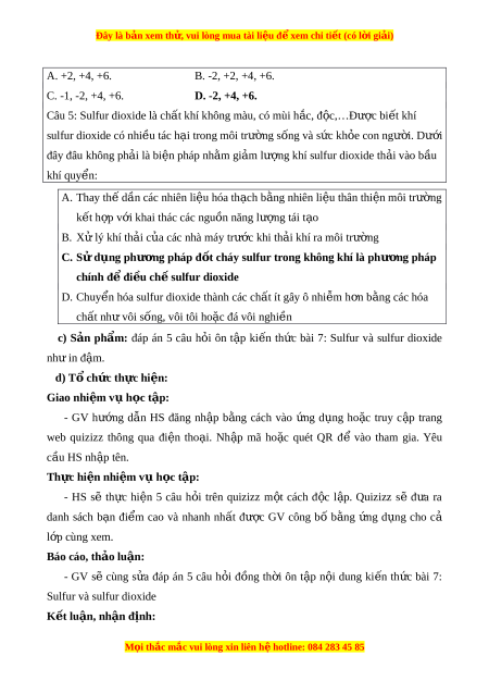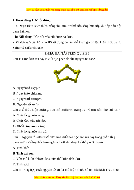 ụ tiêu: Kích thích h ng ứ thú, t o ạ tư thế s n ẵ sàng h c ọ t p ậ và ti p ế c n ậ n i ộ dung bài h c. ọ b) N i ộ dung: Dẫn d t ắ vào n i ộ dung bài h c. ọ - GV đ a ư ra 5 câu h i ỏ cho HS s ử d ng ụ quizizz đ ể tham gia ôn t p ậ ki n ế th c ứ bài 7: Sulfur và sulfur dioxide. PHI U Ế BÀI T P Ậ TRÊN QUIZIZZ Câu 1: Hình nh s ả au đây là c u t ấ o ạ phân t c ử a nguyên t ủ nào? ố A. Nguyên tố oxygen. B. Nguyên tố chlorine. C. Nguyên tố nitrogen. D. Nguyên t s ố ulfur. Câu 2: đ Ở i u ề ki n t ệ hư ng, ờ đ n ch ơ t ấ sulfur có tr ng ạ thái và màu s c ắ nh t ư h nào? ế A. Chất l ng, ỏ màu vàng. B. Ch t ấ r n, m ắ àu nâu đ . ỏ C. Chất r n, m ắ àu vàng. D. Chất l ng, ỏ màu nâu đ . ỏ