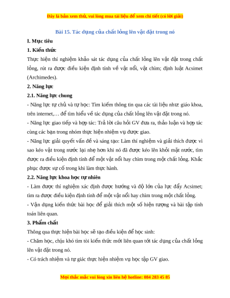 Bài 15. Tác dụng c a ch ủ ất l ng l ỏ ên v t ậ đ t ặ trong nó I. M c t ụ iêu 1. Ki n t ế h c ứ Th c ự hi n ệ thí nghi m ệ kh o ả sát tác d ng ụ c a ủ ch t ấ l ng ỏ lên v t ậ đ t ặ trong ch t ấ l ng, ỏ rút ra đư c ợ đi u ề ki n ệ đ nh ị tính về v t ậ n i ổ , v t ậ chìm; đ nh ị lu t ậ Acsimet (Archimedes). 2. Năng l c ự 2.1. Năng l c chung ự - Năng l c ự t ự chủ và tự h c: ọ Tìm ki m