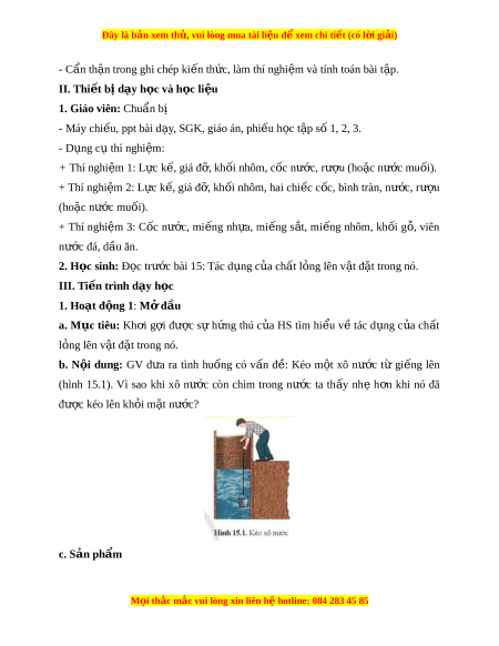 1. Giáo viên: Chuẩn bị - Máy chi u, ppt ế bài d y ạ , SGK, giáo án, phi u ế h c t ọ p s ậ ố 1, 2, 3. - D ng c ụ t ụ hí nghi m ệ : + Thí nghi m ệ 1: L c ự k , gi ế á đ , kh ỡ i ố nhôm, c c ố nư c, r ớ ư u ( ợ ho c n ặ ư c ớ mu i ố ). + Thí nghi m ệ 2: L c ự k , ế giá đ , ỡ kh i ố nhôm, hai chi c ế c c, ố bình tràn, nư c, ớ rư u ợ (ho c ặ nư c m ớ uối). + Thí nghi m ệ 3: C c ố nư c, ớ mi ng ế nh a, ự mi ng ế s t ắ , mi ng ế nhôm, kh i ố g , ỗ viên nư c ớ đá, d u ăn. ầ 2. H c ọ sinh: Đ c ọ trư c ớ bài 15: Tác d ng c ụ a ủ ch t ấ l ng l ỏ ên v t ậ đ t ặ trong nó. III. Ti n t ế rình d y h ạ c ọ 1. Hoạt đ ng 1 ộ : M đ ở ầu a. Mục tiêu: Kh i ơ g i ợ đư c ợ sự h ng ứ thú c a ủ HS tìm hi u ể v ề tác d ng ụ c a ủ ch t ấ l ng l ỏ ên v t ậ đ t ặ trong nó. b. N i