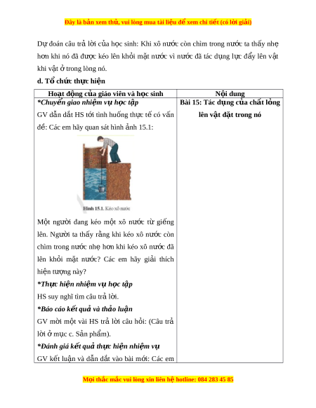 ề Các em hãy quan sát hình nh ả 15.1: M t ộ ngư i ờ đang kéo m t ộ xô nư c ớ từ gi ng ế lên. Ngư i ờ ta th y ấ r ng ằ khi kéo xô nư c ớ còn chìm trong nư c ớ nhẹ h n ơ khi kéo xô nư c ớ đã lên kh i ỏ m t ặ nư c? ớ Các em hãy gi i ả thích hiện tư ng này? ợ *Th c ự hi n nhi ệ m ệ v h ụ c t ọ p ậ HS suy nghĩ tìm câu tr l ả i ờ . *Báo cáo k t
