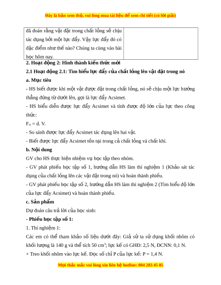 : Hình thành ki n t ế h c m ứ i ớ 2.1 Hoạt đ ng 2.1 ộ : Tìm hi u l ể c đ ự y c ẩ a ch ủ t ấ l ng l ỏ ên v t ậ đ t ặ trong nó a. Mục tiêu - HS bi t ế đư c ợ khi m t ộ v t ậ đư c ợ đ t ặ trong ch t ấ l ng, ỏ nó s ẽ ch u ị m t ộ l c ự hư ng ớ th ng ẳ đ ng t ứ d ừ ư i ớ lên, g i ọ là l c đ ự y ẩ Acsimet. - HS bi u ể di n ễ đư c ợ l c ự đ y ẩ Acsimet và tính đư c ợ độ l n ớ c a ủ l c ự theo công th c: ứ FA = d. V. - So sánh đư c ợ l c đ ự y ẩ Acsimet tác d ng l ụ ên hai v t ậ . - Bi t ế đư c ợ l c đ ự y ẩ Acsimet t n t ồ i ạ trong c ch ả t ấ l ng và ch ỏ t ấ khí. b. N i ộ dung GV cho HS th c hi ự n nhi ệ m ệ v h ụ c t ọ p ậ theo nhóm. - GV phát phi u ế h c ọ t p ậ số 1, hư ng ớ d n ẫ HS làm thí nghi m ệ 1 (Kh o ả sát tác d ng c ụ a ủ ch t ấ l ng l ỏ ên các v t ậ đ t