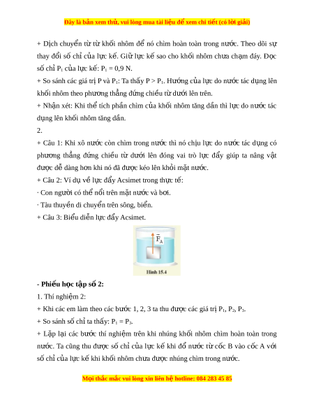 ẩy Acsimet) và hoàn thành phi u. ế c. Sản phẩm Dự đoán câu tr l ả i ờ c a ủ h c s ọ inh: - Phi u h ế c t ọ p s ậ 1 ố : 1. Thí nghi m ệ 1: Các em có thể tham kh o ả số li u ệ dư i
