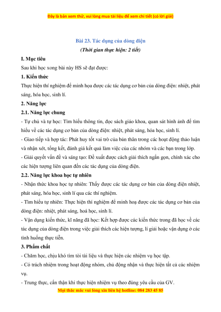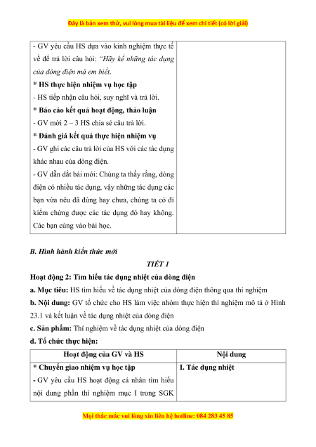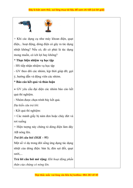 - Nhận thức khoa học tự nhiên: Thấy được các tác dụng cơ bản của dòng điện nhiệt,