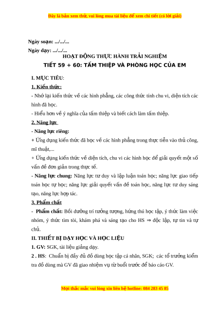 TIẾT 59 + 60: TẤM THIỆP VÀ PHÒNG HỌC CỦA EM I. M C Ụ TIÊU: 1. Ki n t ế h c ứ : - Nhớ l i ạ ki n ế th c ứ v các ề hình ph ng, ẳ các công th c ứ tính chu vi, di n ệ tích các hình đã h c. ọ - Hi u ể h n v ơ ý nghĩ ề a c a ủ t m ấ thi p và bi ệ t ế cách làm t m ấ thi p. ệ 2. Năng l c ự - Năng l c ri ự êng: + Ứng d ng ki ụ n ế th c ứ đã h c ọ về các hình ph ng ẳ trong th c ự ti n ễ vào th ủ công, mĩ thu t ậ ,... + ng Ứ d ng ụ ki n ế th c ứ về di n