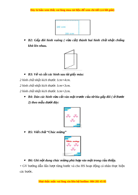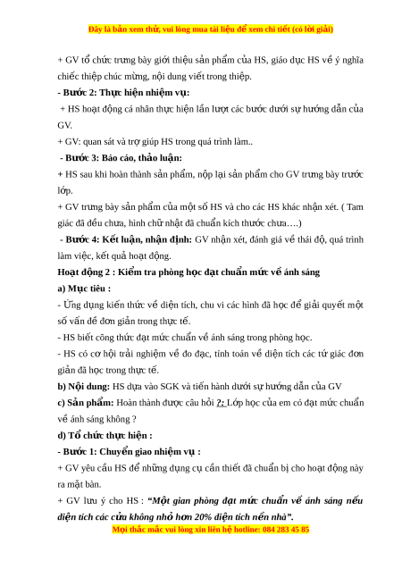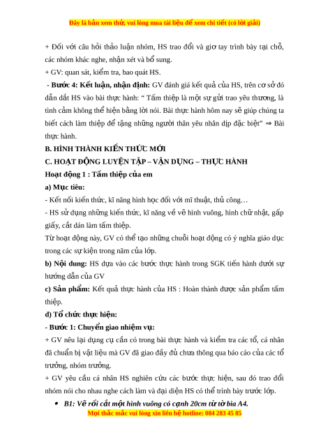 B. HÌNH THÀNH KI N Ế TH C Ứ M I Ớ C. HOẠT Đ N Ộ G LUY N Ệ T P Ậ – V N Ậ D N Ụ G – TH C Ự HÀNH Hoạt đ ng 1 ộ : Tấm thi p c ệ a em ủ a) M c t ụ iêu: - K t ế nối ki n t ế h c, kĩ ứ năng hình h c ọ đ i ố v i ớ mĩ thu t ậ , th công… ủ - HS sử d ng ụ nh ng ữ ki n ế th c, ứ kĩ năng v ề v ẽ hình vuông, hình ch ữ nh t ậ , g p ấ giấy, c t ắ dán làm tấm thi p. ệ Từ ho t ạ đ ng ộ này, GV có th ể t o ạ nh ng ữ chu i ỗ ho t ạ đ ng ộ có ý nghĩa giáo d c ụ trong các s ki ự n t ệ rong năm c a l ủ p. ớ b) N i ộ dung: HS d a ự vào các bư c ớ th c ự hành trong SGK ti n ế hành dư i ớ sự hư ng d ớ ẫn c a G ủ V c) S n ả ph m ẩ : K t ế quả th c ự hành c a ủ HS : Hoàn thành đư c ợ s n ả ph m ẩ t m ấ thi p. ệ