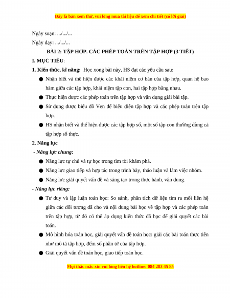 BÀI 2: TẬP HỢP. CÁC PHÉP TOÁN TRÊN TẬP HỢP (3 TIẾT) I. MỤC TIÊU: