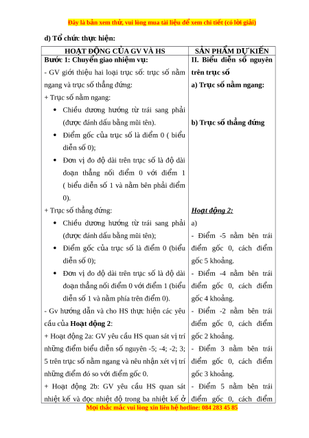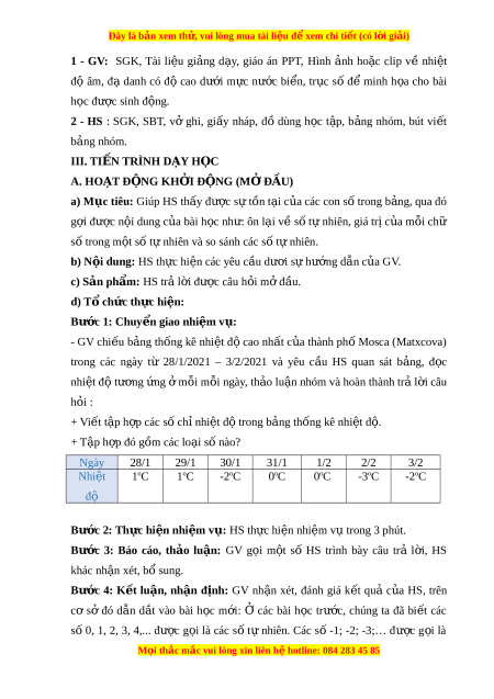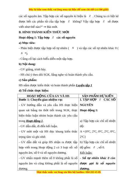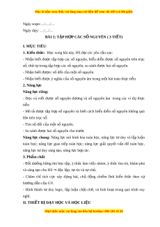 Đây là bản xem th , vu ử i lòng mua tài li u ệ đ xe ể m chi ti t ế (có l i ờ gi i ả ) Ngày so n: ạ …/…./… Ngày d y: ạ …/…/… BÀI 2: TẬP H P Ợ CÁC S N Ố GUYÊN ( 3 TI T Ế ) I. M C Ụ TIÊU: 1. Ki n t ế h c ứ : H c ọ xong bài này, HS đ t ạ các yêu c u s ầ au: - Nh n ậ bi t ế đư c ợ t p ậ h p ợ các s ố nguyên, bi u ể di n ễ đư c ợ s ố nguyên trên tr c ụ số, th t ứ t ự rong t p h ậ p các ợ s nguyên, s ố o sánh đư c ợ hai s nguyên. ố - Nh n ậ bi t ế đư cc ợ s đ ố i ố c a ủ m t ộ s nguyên. ố - Nh n ậ bi t ế đư c ợ ý nghĩa c a s ủ nguyên âm ố trong m t ộ bài toán th c ự ti n. ễ 2. Năng l c ự Năng l c ự riêng: - Đ c ọ và vi t ế đư c ợ số nguyên dư ng