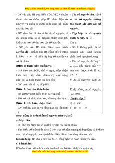ơ và số nguyên âm trong các ví dụ th c ự ti n ễ - Mô tả đư c ợ t p ậ h p ợ số nguyên và bi t ế cách bi u ể di n ễ s ố nguyên không quá l n t ớ rên tr c s ụ ố. - Tìm số đối c a m ủ t ộ số nguyên. - So sánh đư c hai ợ số nguyên cho trư c ớ Năng l c ự chung: Năng l c ự mô hình hóa toán h c, ọ năng l c ự t ư duy và l p ậ lu n ậ toán h c; ọ năng l c ự giao ti p ế toán h c; ọ năng l c ự gi i ả quy t ế v n ấ đề toán h c, ọ năng l c t ự duy s ư áng t o, năng ạ l c h ự p t ợ ác. 3. Ph m ẩ chất - Bồi dư ng ỡ h ng t ứ hú h c t ọ p, ậ ý th c l ứ àm vi c nhóm ệ , ý th c t ứ ìm tòi, khám phá và sáng t o cho H ạ S ⇒ đ c l ộ p, ậ t t ự in và t ch ự . ủ - Chăm chỉ tích c c ự xây d ng ự bài, chủ đ ng ộ chi m ế lĩnh ki n ế th c ứ theo sự hư ng d ớ ẫn c a G ủ V.