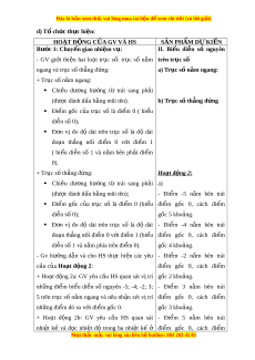 Ví dụ không là số nguyên: - HS gi t ơ ay phát bi u, t ể rình bày t i ạ ch . ỗ -2,3 ; 9,8… - M t ộ số HS khác nh n ậ xét, b s ổ ung cho b n. ạ Luy n t ệ p 1. ậ Bư c ớ 4: K t ế lu n, nh ậ n đ ậ nh: ị a) -6 ϵ Z - GV ch t ố l i ạ đáp án và t ng ổ quát l i ạ t p ậ h p ợ b) -10 ∉ N . Z . Hoạt đ ng 2: ộ Bi u di ể n s ễ n ố guyên trên tr c ụ số a) M c t ụ iêu: - HS nhớ l i ạ đư c t ợ ia số và th t ứ c ự a các ủ s t ố nhi ự ên. - Tìm hi u ể v ề bi u ể di n ễ các s ố trên tr c ụ s ố n m ằ ngang, th ng ẳ đ ng ứ và bi t ế so