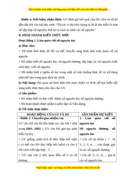 B. HÌNH THÀNH KI N Ế TH C Ứ M I Ớ Hoạt đ ng 1: ộ Làm quen v i ớ s n ố guyên âm a) M c t ụ iêu: + Từ hình nh ả th c ự tế HS có thể chuy n ể sang hình nh ả tr c ự quan về số nguyên. + HS nh n ậ bi t ế số nguyên âm, s ố nguyên dư ng, ơ t p ậ h p ợ các s ố nguyên; bi t ế cách đ c, ọ vi t ế số nguyên. + HS nh n ậ bi t