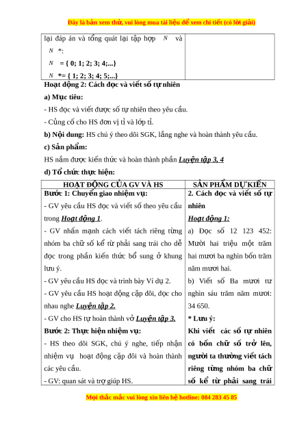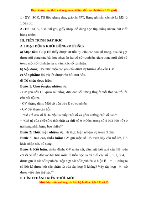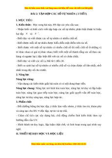 Đây là bản xem th , vu ử i lòng mua tài li u ệ đ xe ể m chi ti t ế (có l i ờ gi i ả ) BÀI 2: TẬP H P Ợ CÁC S Ố T N Ự HIÊN ( 3 TI T Ế ) I. M C Ụ TIÊU: 1. Ki n t ế h c ứ : H c ọ xong bài này, HS đ t ạ các yêu c u s ầ au: - Nh n ậ bi t ế và bi t ế cách vi t ế t p ậ h p ợ các s ố t ự nhiên; phân bi t ệ đư c ợ kí hi u ệ hai t p ậ N và N *. - Bi t ế đ c và vi ọ t ế đư c ợ các số t nhi ự ên có nhi u ch ề s ữ ố. - Bi t ế đư c m ợ ỗi số t nhi ự ên đư c ợ bi u di ể n m ễ t ộ đi m ể trên tia s . ố - Bi t ế đư c ợ v i ớ m t ộ số tự nhiên có nhi u ề chữ số thì m i ỗ chữ số ở nh ng ữ vị