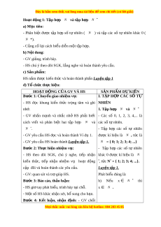 ộ số HS trình bày câu trả l i ờ , HS khác nh n ậ xét, bổ sung. Bư c ớ 4: K t ế lu n, ậ nh n ậ đ n ị h: GV nh n ậ xét, đánh giá k t ế quả c a ủ HS, trên cơ sở đó d n ẫ d t ắ vào bài h c ọ m i ớ : Ở ti u ể h c, ọ ta đã bi t ế các s ố 0, 1, 2, 3, 4,... đư c ợ g i ọ là các số t nhi ự ên. T p ậ h p ợ các s ố t ự nhiên kí hi u ệ là N . Chúng ta có li t ệ kê đư c ợ h t ế các ph n ầ tử c a ủ t p ậ h p ợ N không? V y ậ t p ậ h p ợ N sẽ đư c vi ợ t ế như thế nào?”
