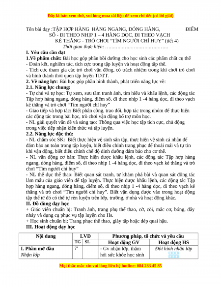 Giáo án Tập hợp hàng ngang, dóng hàng, điểm số - đi theo nhịp 1-4 hàng dọc, đi theo vạch kẻ thẳng Gdtc 3 Chân trời sáng tạo