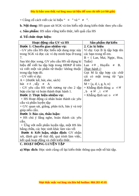 Đây là bản xem th , vu ử i lòng mua tài li u ệ đ xe ể m chi ti t ế (có l i ờ gi i ả ) a. M c ụ đích: HS c m ả th y ấ khái ni m ệ t p ậ h p ợ g n ầ gũi v i ớ đ i ờ s ng ố hàng ngày. b. N i