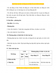Phương pháp, tổ chức và yêu cầu Nội dung Thời Số Hoạt động GV Hoạt động HS gian lượng I. Phần mở đầu 5 – 7’ 1. Nhận lớp Gv nhận lớp, thăm Đội hình nhận lớp hỏi sức khỏe học