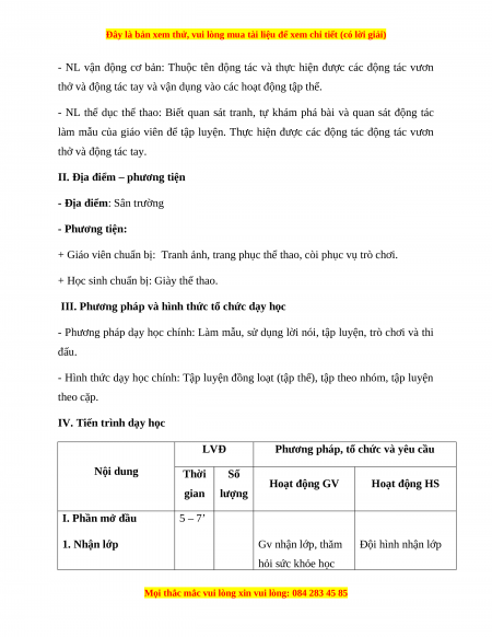 - Phương pháp dạy học chính: Làm mẫu, sử dụng lời nói, tập luyện, trò chơi và thi đấu.