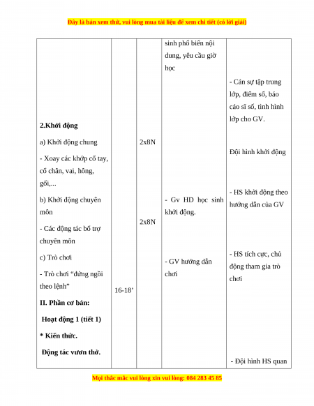 sinh phổ biến nội dung, yêu cầu giờ học - Cán sự tập trung lớp, điểm số, báo cáo sĩ số, tình hình lớp cho GV. 2.Khởi động a) Khởi động chung 2x8N Đội hình khởi động - Xoay các khớp cổ tay, cổ chân, vai, hông, gối,... - HS khởi động theo b) Khởi động chuyên