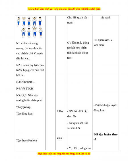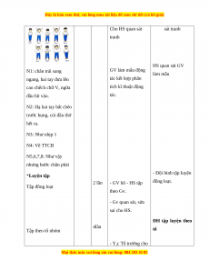 Cho HS quan sát sát tranh tranh HS quan sát GV N1: chân trái sang GV làm mẫu động làm mẫu ngang, hai tay đưa lên tác kết hợp phân cao chếch chữ V, ngửa tích kĩ thuật động đầu hít vào. tác. N2: Hạ hai tay bắt chéo