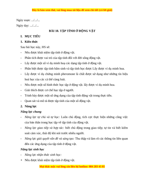 Giáo án Tập tính ở động vật Sinh học 11 Chân trời sáng tạo