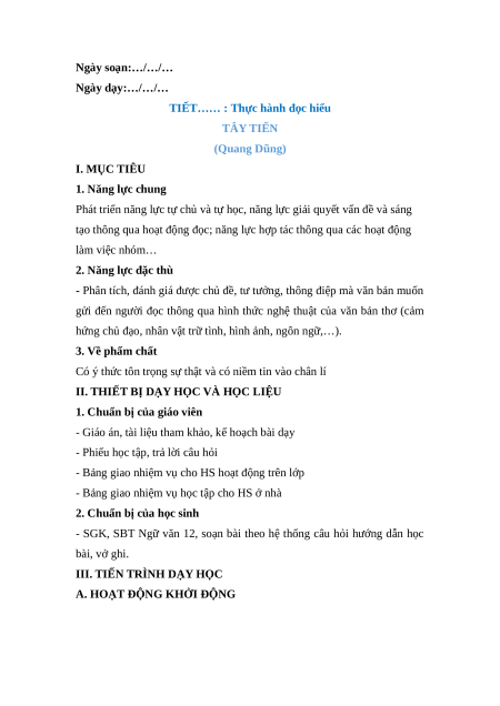 TIẾT…… : Thực hành đọc hiểu TÂY TIẾN (Quang Dũng) I. MỤC TIÊU 1. Năng lực chung