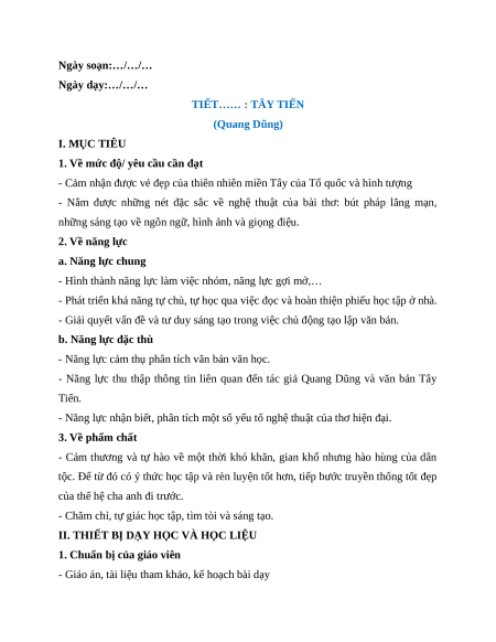 TIẾT…… : TÂY TIẾN (Quang Dũng) I. MỤC TIÊU