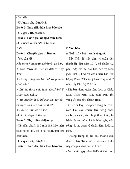 - Năng lực thu thập thông tin liên quan đến tác giả Quang Dũng và văn bản Tây Tiến.