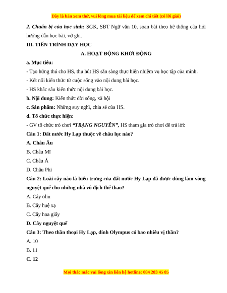 2. Chuẩn bị của học sinh: SGK, SBT Ngữ văn 10, soạn bài theo hệ thống câu hỏi